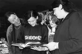 Eine Gruppe von Schülerinnen durchforstet Bücher