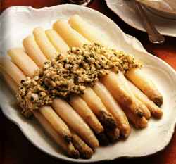 Lavare gli asparagi, pulirli cominciando dalla cima, tagliare la parte più dura (1-2 cm). Mettete gli asparagi in una pentola, coprirli con dell'acqua, aggiungere il burro, sale e zucchero. Coprire con della carta imburrata e fare bollire a fuoco lento fin quando tutto il liquido si sarà consumato e gli asparagi saranno cotti (20 minuti circa). Nel frattempo fare bollire le uova per 8 minuti, lasciarle raffreddare e sgusciarle. Aggiungere gli altri ingredienti. Alla fine aggiungere le erbe finemente tritate e gli albumi. Mettere gli asparagi su un piatto già scaldato (riscaldare anche i piatti!) e servirli con la salsa a parte.