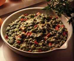 Lavare gli spinaci, lessarli in poca acqua salata, strizzarli bene e passarli al setaccio. Con gli spinaci, il latte, la farina, le uova ed il sale fare una pastella di media consistenza e sbatterla. Servendosi dell'apposito colino per gnocchetti, passare la pastella nell'acqua salata bollente. In mancanza di questo colino spalmare la pastella su di un tagliere inumidito e con l'aiuto del rovescio di un coltello far scendere delle piccole fettuccine di pastella nell'acqua bollente. Appena gli gnocchetti verranno a galla, toglierli dall'acqua con una schiumarola e passarli in un recipiente pieno d'acqua fredda. Soffriggere il prosciutto tritato nel burro, annaffiare con vino bianco, lasciare evaporare un poco, aggiungere la panna, portare nuovamente ad ebollizione, salare, pepare ed unire il parmigiano. Ripassare gli gnocchetti in questo composto e servirli in una terrina ben calda.