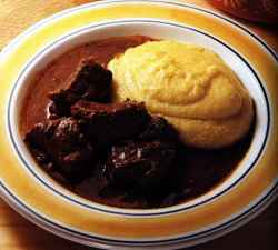 Riscaldare lo strutto in una casseruola profonda, aggiungere la cipolla tagliata a rondelle e dorarla. Tagliare la carne in cubetti, mettere la cipolla da una parte della casseruola e far cuocere bene la carne nello strutto restante, mischiare con la cipolla e lasciare cuocere, fino a quando non si sia formata una crosta marrone sul fondo della pentola. Aggiungere il vino rosso e l'aceto, e lasciare cuocere e salare. Insaporire con della paprika e innaffiare con un po' d'acqua e lasciare cuocere per 1 ora, un'ora e ½ nello stesso sugo (è necessario aggiungere dell'acqua). Tritare finemente le spezie e mescolarle col burro e il succo di limone nel gulasch. Servire con la polenta.