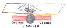 Wenn man zwei Geomag-Magnete mit einer Eisenkugel zusammenhängt und